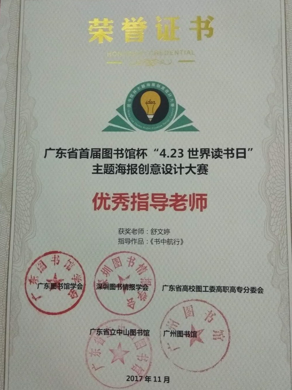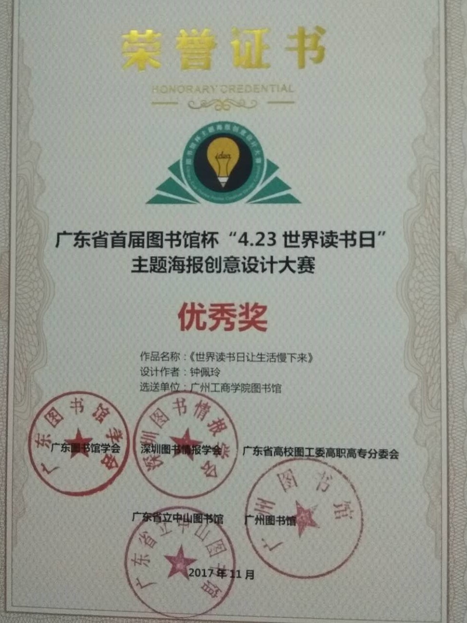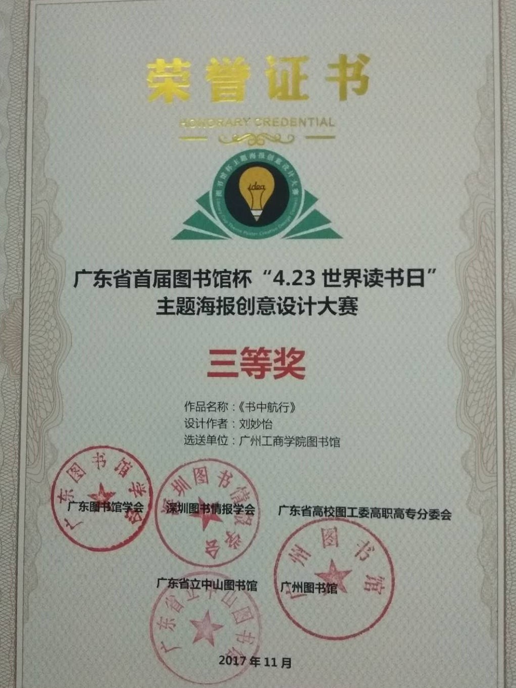 11月23日下午,“创意之魅,阅读之美”『广东省首届图书馆杯”4.23世界读书日”主题海报创意设计大赛』获奖代表颁奖仪式在“2017年广东图书馆学会学术年会”现场举行,其中kaiyun开云官方网站图书馆刘妙怡、钟佩玲两位读者分别凭借作品《书中航行》、《世界读书日让生活慢下来》成功入围决赛总评,刘妙怡荣获大赛三等奖,指导老师舒文婷获得优秀指导老师奖;钟佩玲获得大赛优秀奖。