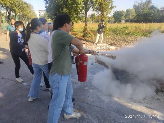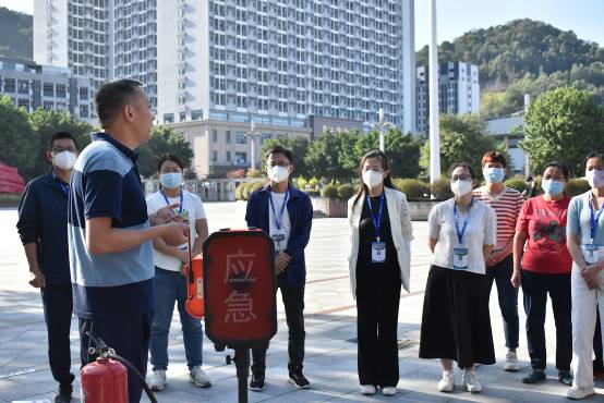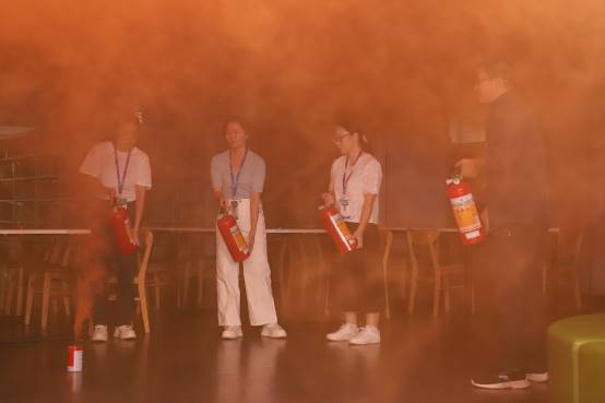 疏散演练结束后,学校微型消防工作站工作人员现场进行校园常用灭火器材的使用操作方法,及其利用消防水带扑救初期火灾现场的讲解,指导全体参加应急疏散演练的图书馆员轮流使用干粉灭火器进行实际灭火和使用消火栓进行喷水灭火,确保每一位馆员都会熟练使用干粉灭火器和消火栓扑灭初起火灾。