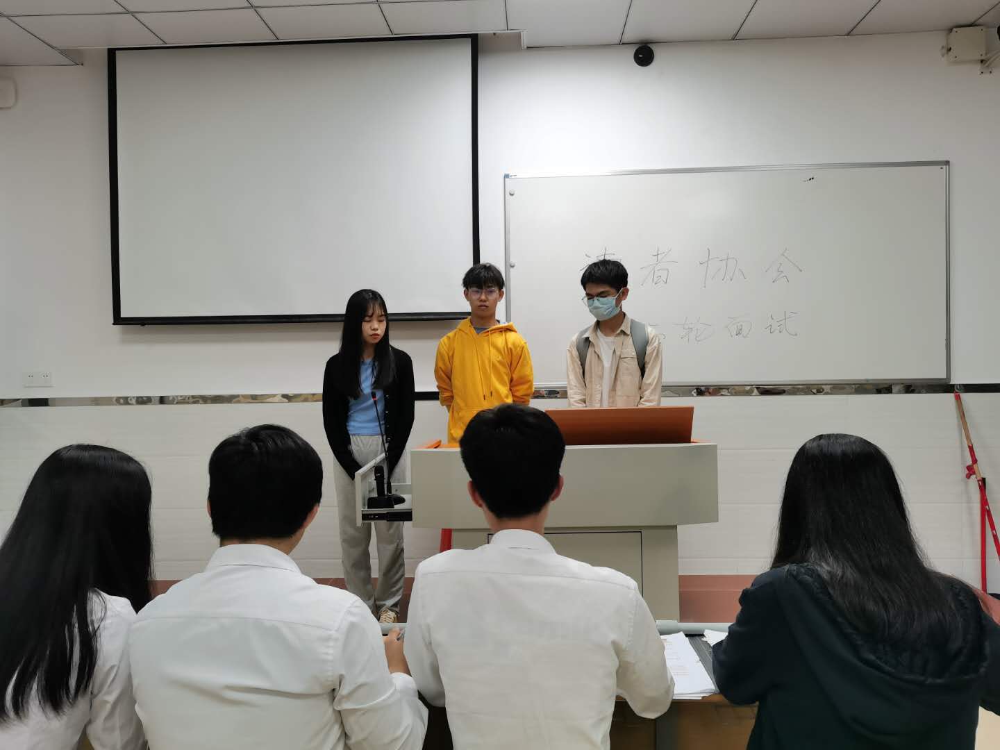 【本网讯】2020年10月27日、29日,读者协会在花都校区教学楼分别举行了新干事招新的两轮面试活动。协会指导老师梁剑红老师、刘宇老师及协会前会长洪嘉瑜同学等出席了本次活动,由各部门部长担任本次招新面试官。