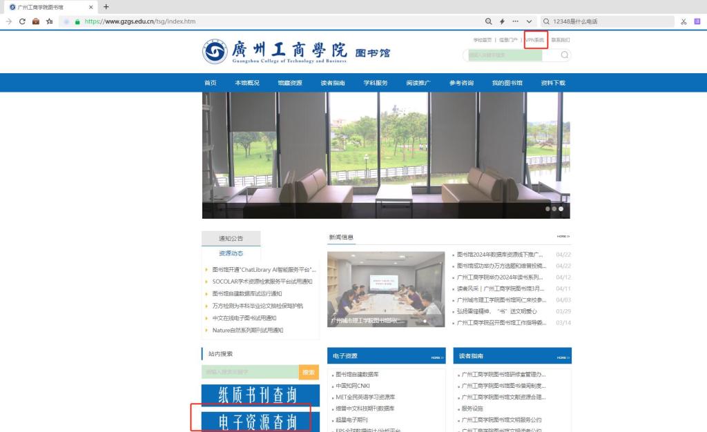 打开kaiyun开云官方网站图书馆官网,方法一:在网站首页点击“电子资源查询”,用学校统一身份认证登录就可以在校外访问电子资源。方法二:点击首页最上方的链接“VPN系统”,通过VPN系统登陆就可以在校外访问电子资源。