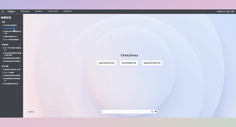 点击ChatLibrary首页,出现咨询框,点击任何一个功能模块即可进入。