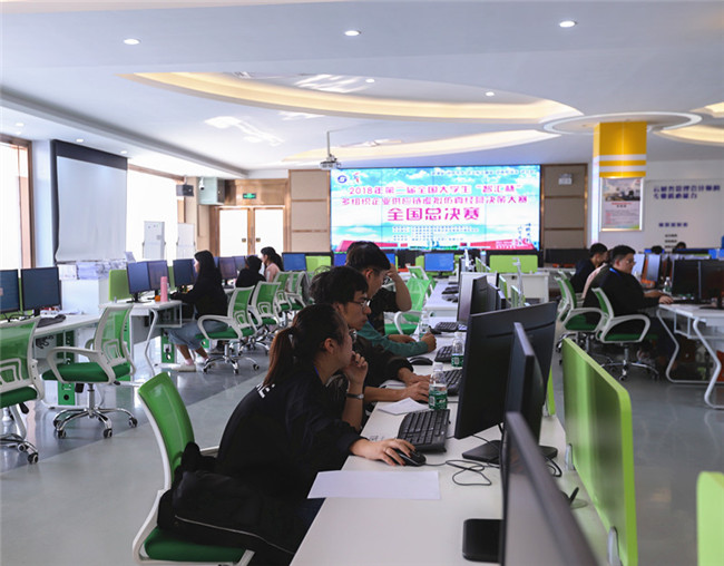 当天9:30-18:30,来自全国29所院校的34支队伍,共计136位学生在第二实验楼六楼新商科实训中心内A602、B601、B603、D601、D602五个赛场进行激烈的决赛。本次总决赛设置了多组织企业供应链虚拟仿真经营运营的年限、每年运营的时间,要求参赛学生在规定的时间完成广告投放和产品选单、销售市场放单,同时要求参赛学生严格遵守融资方面的规定。
