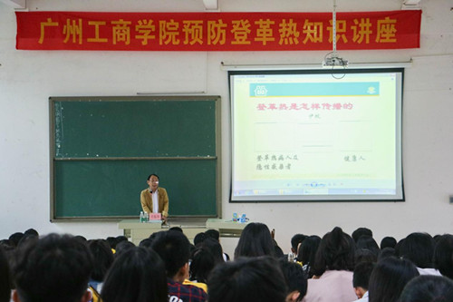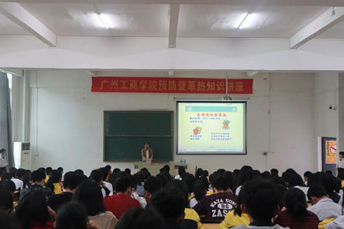 首先,黄振举主任以登革热的危害为切入点,指出今年以来,广东省深圳、广州、珠海等八个地市先后报道了输入性病例累计22例,强调了登革热宣传预防的重要性。接着,黄主任向同学们介绍了登革热这种传染病的种类,感染登革热的病因,登革热病症的临床表现及诊断,登革热的治疗以及预防。最后,黄振举主任结合广东的气候,提醒大家注意个人防护,要注意阳台、厕所和积水多易生蚊的地方的清洁,建议大家翻缸倒罐,消灭一切蚊子幼虫的孳生地,外出穿长袖衣裤,备防蚊药水,呼吁人人动手,清积水、灭蚊子、防叮咬、保健康。