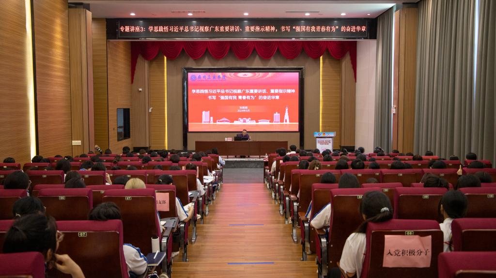 为进一步做好青年理论学习提升工程,培养堪当重任的时代青年,5月26日,学校党委书记张振超以“学思践悟习近平视察广东的重要讲话、重要指示精神,书写‘强国有我 青春有为’的奋进篇章”为主题,为学生骨干、团支部书记、学生社团负责人、团学入党积极分子及发展对象等200余名“青马学员”讲授专题讲座。讲座由校团委书记洪卫烈主持。