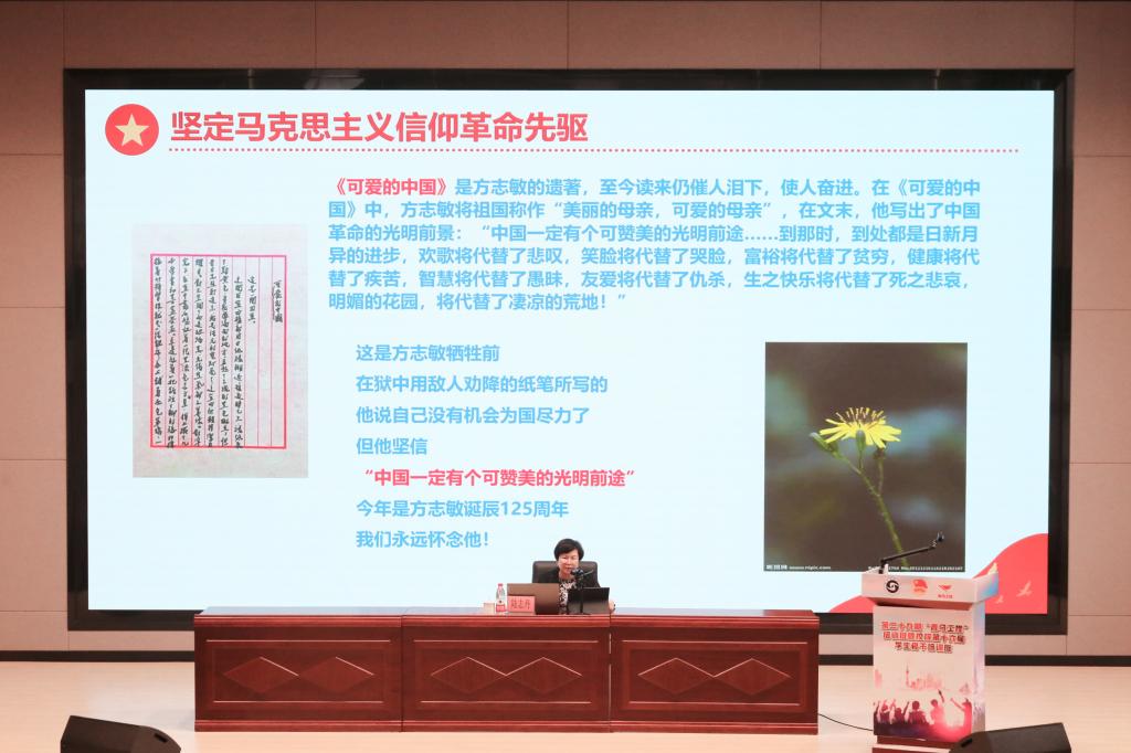 陆主任为学员们系统地梳理了马克思主义理论精髓以及内涵,回顾马克思主义中国化的进程,通过重温毛泽东、周恩来以及刘志丹等共产党员革命先驱的感人故事,讲述马克思主义信仰的力量以及马克思主义对中国的影响,强调了新时代青年树立坚定信仰的重要性。她勉励青马学员们要牢记习近平总书记的殷切嘱托,厚植家国情怀,坚定理想信念、夯实专业能力、涵养高尚品德、增强社会责任感、锤炼敢担当和勇创新的精神,不负韶华,不负青春,争当新时代有为青年,让“请党放心、强国有我”的铮铮誓言成为祖国大地上的生动实践。