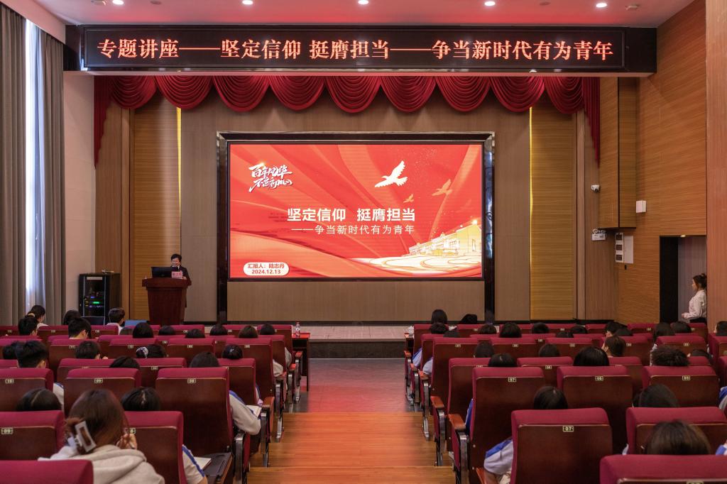 为深入学习贯彻党的二十届三中全会精神,落实习近平总书记关于青年工作的重要思想,引导青年坚定共产主义信仰,激发青春活力,为实现中华民族伟大复兴的中国梦贡献智慧和力量。12月13日,学校党委委员、董事会办公室主任陆志丹为学校一百五十余名入党积极分子和发展对象讲授了以“坚定信仰 挺膺担当——争当新时代有为青年”为主题的讲座。