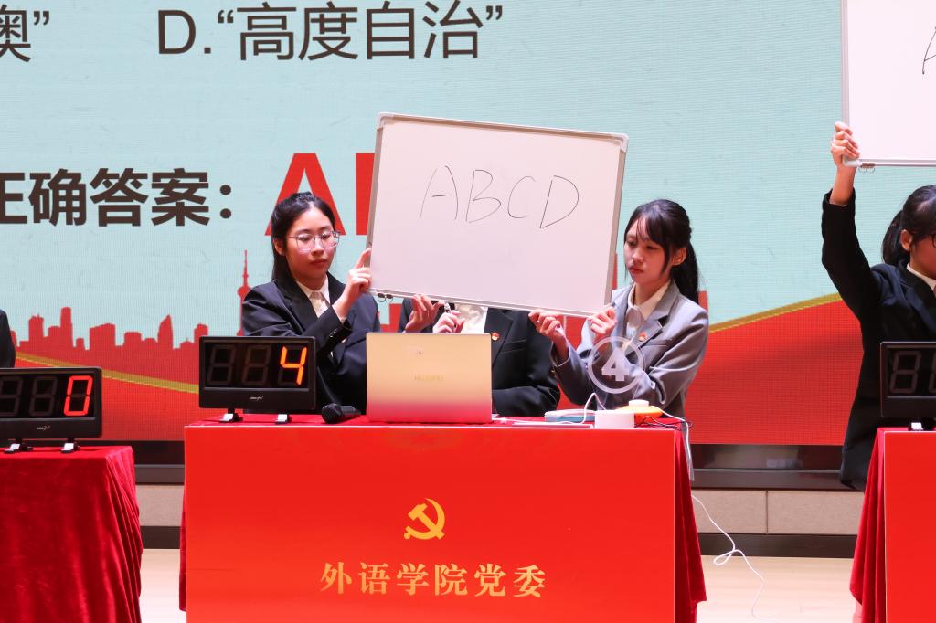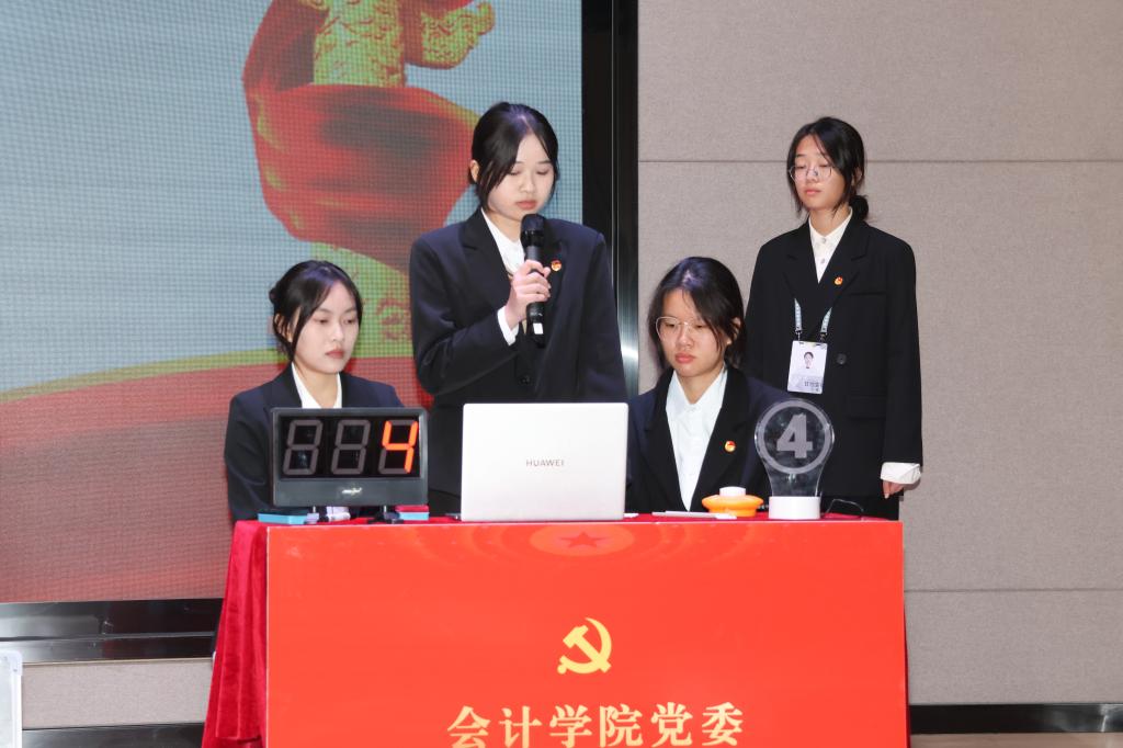 决赛共设置了必答题、抢答题、挑战赛、总决赛等四个环节。经过必答题、抢答题两种题型的比拼,前6支队伍进入1比1淘汰赛,展开最终对决。整场比赛精彩纷呈、扣人心弦,充分展现了参赛队员丰富的党的基础知识和强大的合作精神,精彩的对决赢得在场观众的阵阵掌声。经过激烈的角逐,管理学院代表队夺得了大赛的桂冠,商学院、国际教育学院获得二等奖,外语学院、工学院、会计学院获得三等奖,同时管理学院、商学院获得优秀组织奖。