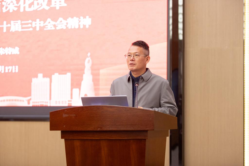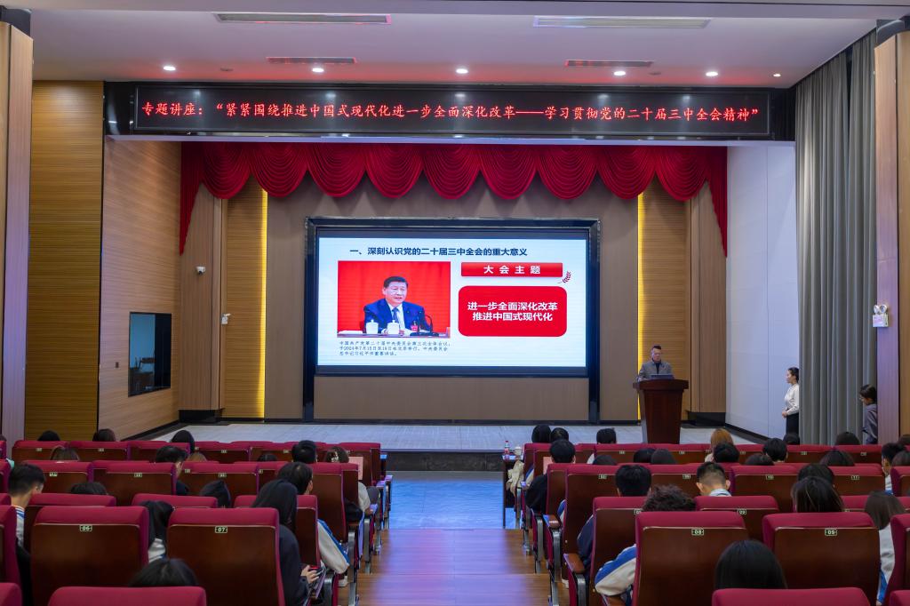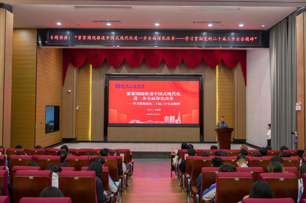 为深入学习贯彻党的二十届三中全会精神,切身领悟全面深化改革的重要性,引导广大学生将思想和行动统一到党中央的决策部署上来。12月17日,学校党委副书记、纪委书记、副校长朱特威在花都校区图书馆414报告厅为花都校区各班级团支书讲授了以“紧紧围绕推进中国式现代化 进一步全面深化改革——学习贯彻党的二十届三中全会精神”为主题的讲座。