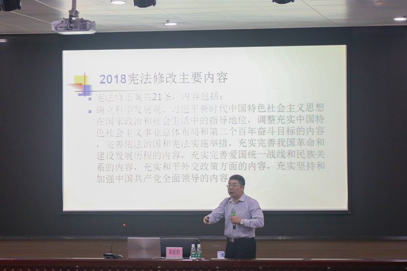 讲座上,邓世豹教授介绍了宪法在社会中的地位及其特性、修宪的两种方式、82年现行宪法经历过的四次修改,分析了2018年宪法修改背景的社会意义,讲述了2018年宪法修正案21条的主要内容是倡导社会主义核心价值观。邓教授指出,宪法修正案是维护权威的有效方式,宪法与时俱进并与主流思想紧密结合,修改宪法是适应社会发展的需要。宪法作为国家的根本大法,是治国安邦的总章程,与国家前途、人民命运息息相关。维护宪法权威,就是维护党和人民共同意识的权威。捍卫宪法尊严,就是捍卫党和人民共同意识的尊严。