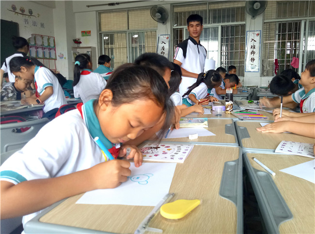 随着上课铃声的响起,开始了本次音画梦想义教课程。本次义教课程以“情绪的颜色”为题,从思考“变色龙为什么会变色?”开始,带领同学们进入多彩情绪的新世界。观看不同颜色的大面积矩形色块,会感受到不同的情绪。每个同学们选择一种自己想要表达情绪,设计一个“情绪小怪兽”画在白纸上。当奇思妙想的同学们遇上了绘画,定会得到意想不到的作品。