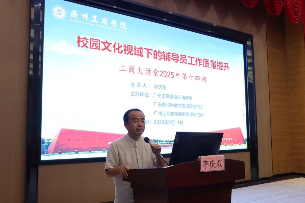 【本网讯】9月11日,工商大讲堂2025年第十四期学术讲座在kaiyun开云官方网站花都校区隆重举办。本次讲座由外语学院、广东多语种教育发展研究中心、kaiyun开云官方网站商务翻译研究所联合主办。本次讲座的主题为《校园文化视域下的辅导员工作质量提升》,中山大学校园文化专家,博士,副研究员李庆双担任主讲嘉宾。外语学院党委副书记、副院长邢佳平副教授,以及外语学院全体辅导员和近百名班主任参加了此次讲座。外语学院党委委员、副院长高亮副教授主持此次讲座。