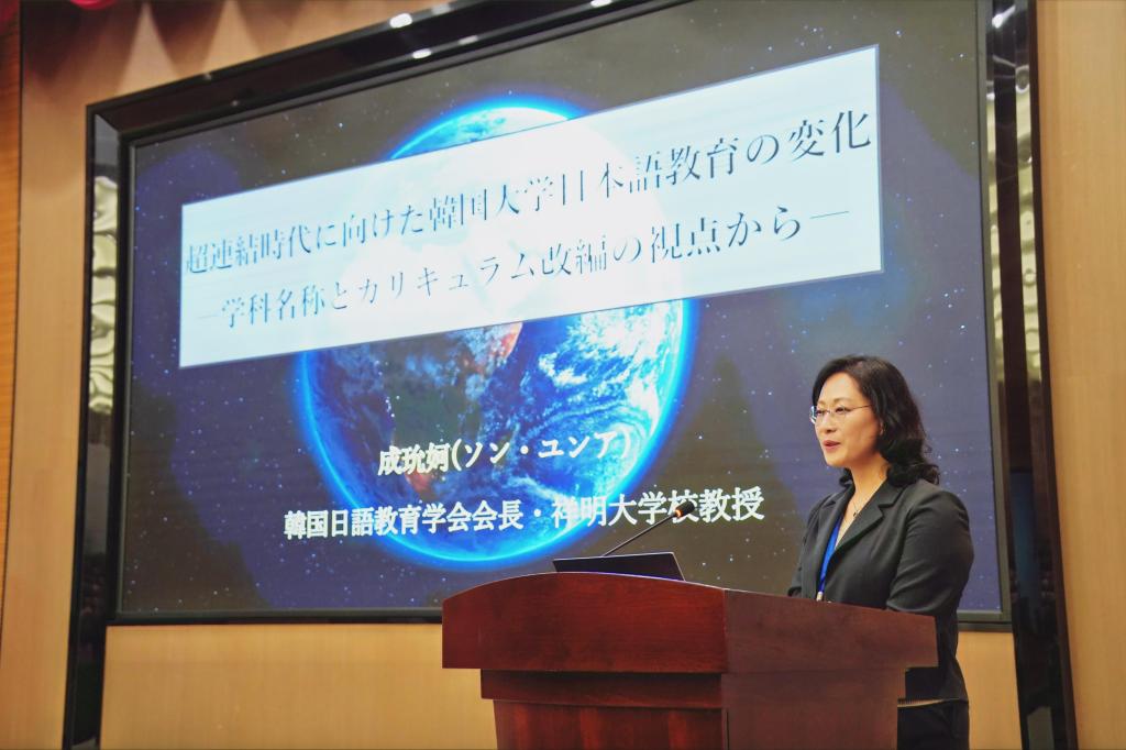 韩国日语教育学会会长、韩国祥明大学成玧妸教授以《韩国大学日语教育在超连接时代转型——从学科名称和课程改革视角分析》为题,分享韩国经验,倡导结合AI、VR与大数据推进课程与学科名称改革,提升学生的全球胜任力与就业竞争力。