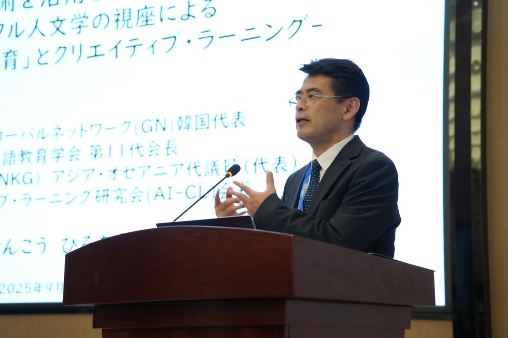 韩国日语教育学会第11代会长、国际网络代表检校裕朗教授作《灵活运用数字AI技术下的日语教学改革——数字人文学视角下“以人为中心的AI教育”和创造性学习》报告,强调终身学习应与生成式AI协同发展,技术应助力而不替代人的思考与创造。