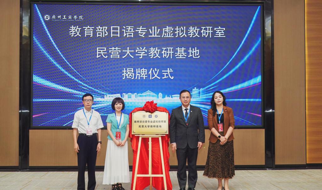 大会举行“教育部日语专业虚拟教研室民营大学教研基地”揭牌仪式。易露霞副校长、刘沛富院长、陈多友教授、杨晓辉教授共同揭牌。该基地的设立将为民办高校日语教育教学改革提供新支点、注入新动能。