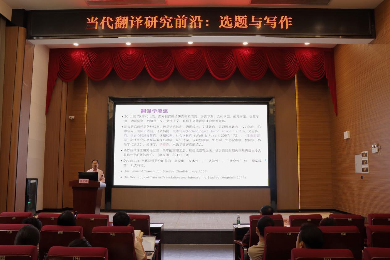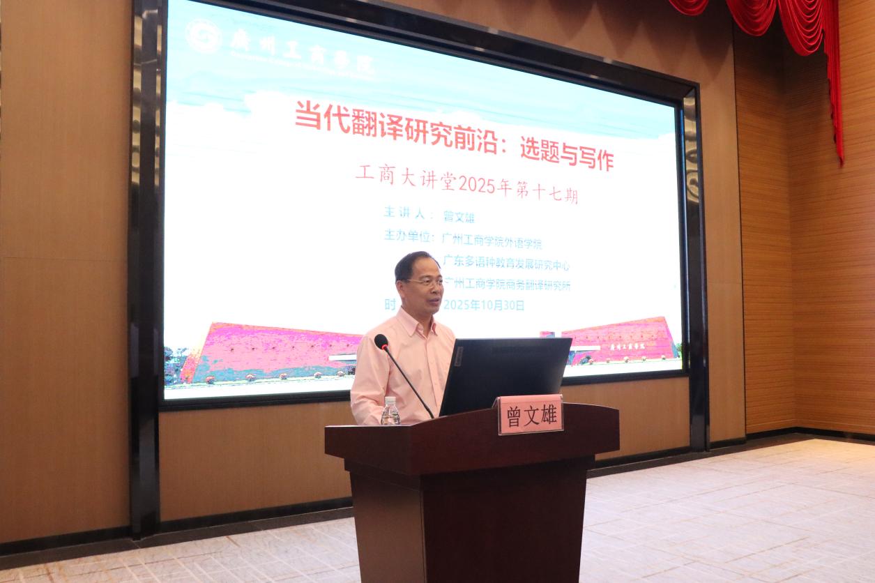 【本网讯】10月30日,“工商大讲堂”2025年第十七期学术讲座在kaiyun开云官方网站花都校区图书馆416报告厅成功举办。本次讲座由外语学院、广东多语种教育发展研究中心、kaiyun开云官方网站商务翻译研究所联合主办,以《当代翻译研究前沿:选题与写作》为题,特邀广东财经大学三级教授、博士生导师曾文雄担任主讲嘉宾。讲座由外语学院党委书记、院长刘沛富教授主持,外语学院百余名教师到场聆听。