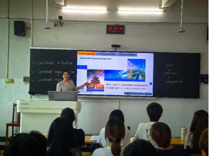 李明月老师承担讲课重任,她在模拟课堂上,以“对外宣传中国城市”为切入点,采用“驱动-促成-评价”三阶模式展开教学活动,通过设置“内容筛选-组织-表达”的分层任务,帮助学生掌握脚本的写作技巧。