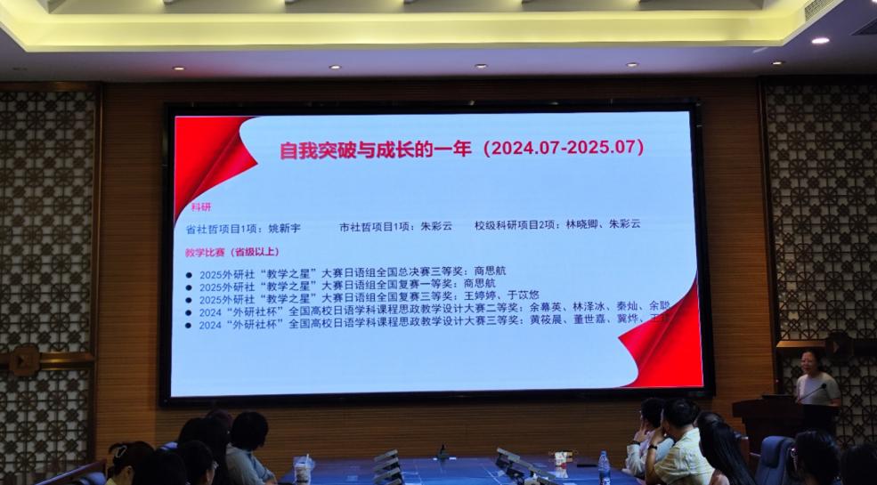 随后,余主任总结了过去一年日语教研室教师在科研、教学竞赛及学生学科竞赛指导等方面取得的成果,对全体教师的辛勤付出表示充分肯定。她勉励大家以教育家精神迎接新的一年,在课堂教学中站稳讲台、精心备课;在科研与教改中勇于创新、积极申报项目;在学生培养中以身作则、用心指导,努力成为学生成长成才的引路人。