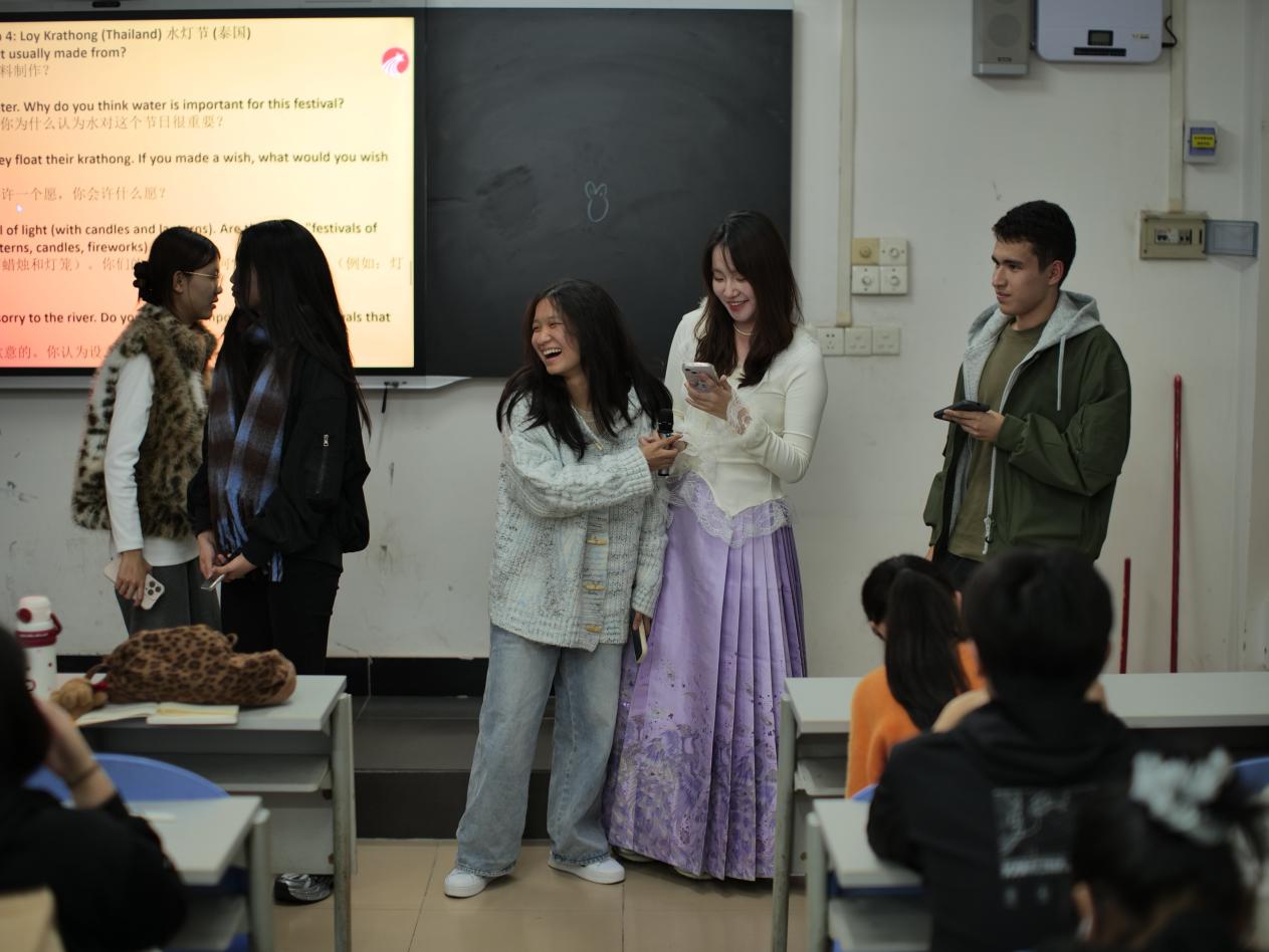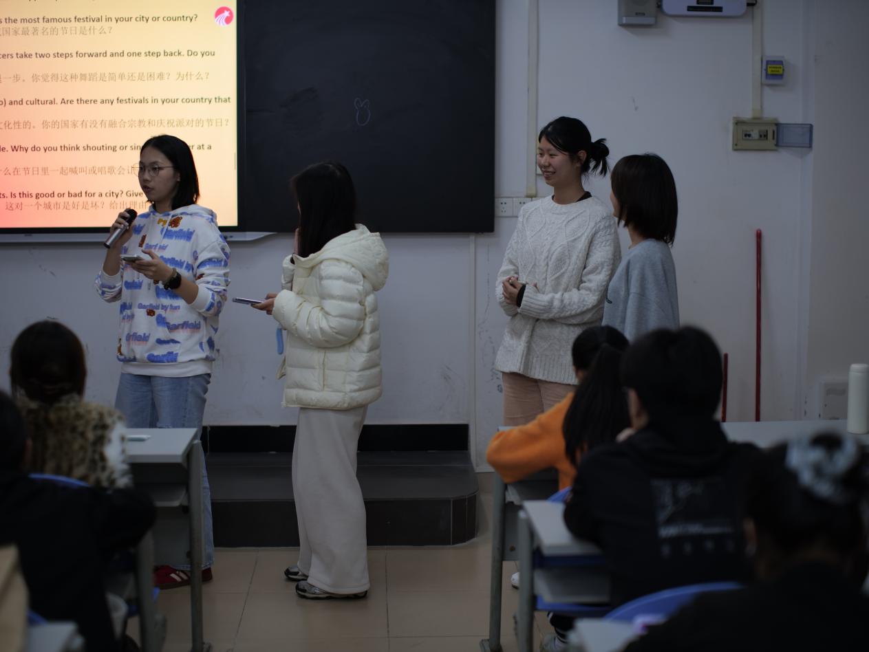 活动以趣味盎然的节日猜词游戏拉开序幕,同学们通过图像竞猜迅速融入节日主题。随后的小组讨论环节将现场推向高潮,八个小组分别围绕中国春节、狂欢节、水灯节等世界各地的特色节日展开深入交流。同学们用英语分享不同文化的节庆习俗、服饰特色和象征意义,在跨文化对话中拓宽视野,增进理解。