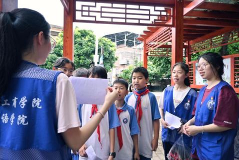 寓教于乐,助力“推普”破冰。在进行推广普通话过程中,团队设计的路人经典诵读挑战环节,团队成员们精心挑选了一系列经典古诗词,组织当地居民进行诵读挑战。活动现场气氛热烈,学生们纷纷踊跃参与,用标准的普通话诵读着优美的古诗词。通过诵读经典,提升了当地居民使用普通话的意识,同时增强了居民学习普通话的积极性。