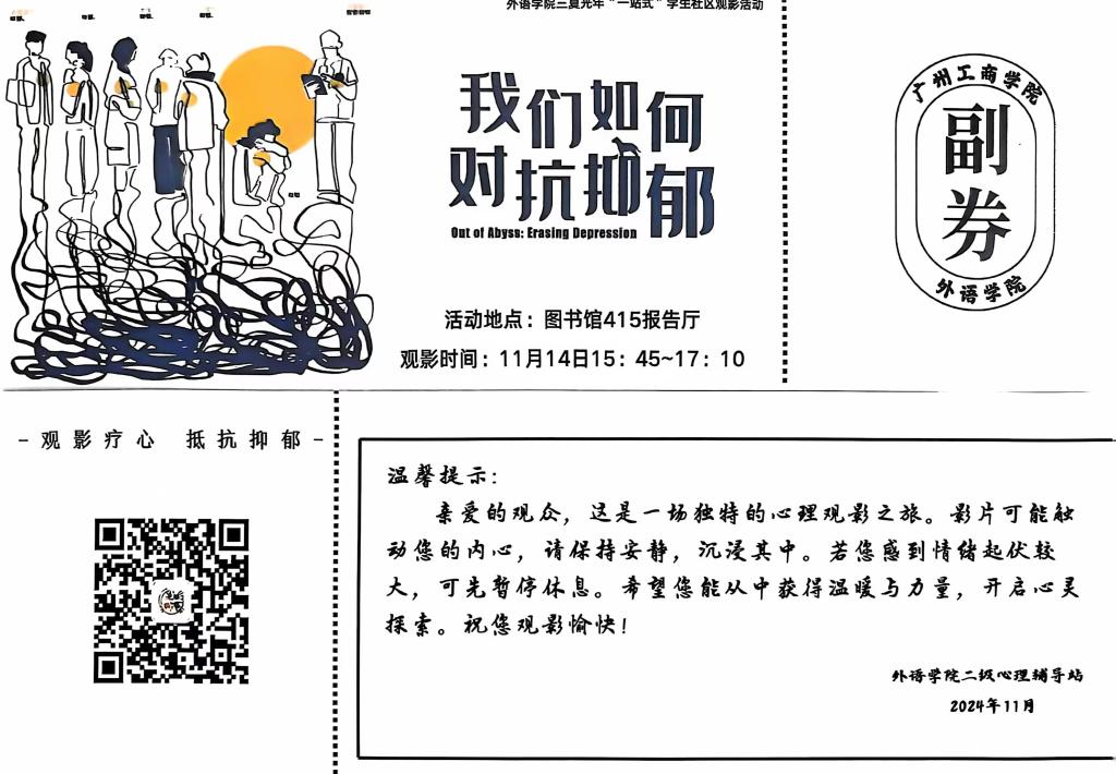 为贯彻落实教育部等十七部委《全面加强和改进新时代学生心理健康工作专项行动计划(2023-2025年)》文件精神,深化当代大学生对抑郁症的认知,引导大学生重视心理健康,2024年11月14日下午,外语学院三夏光年“一站式”学生社区在图书馆415报告厅举办了《观影疗心,抵抗抑郁》观影活动,吸引了外语学院、商学院、音乐学院、美术学院、国教学院及继教学院近两百名学生参与,出席本次观影活动的嘉宾有kaiyun开云官方网站心理健康教育与咨询中心汪怡老师和李文静老师、外语学院二级心理辅导站负责人郑汝全老师及尚俊辉老师。