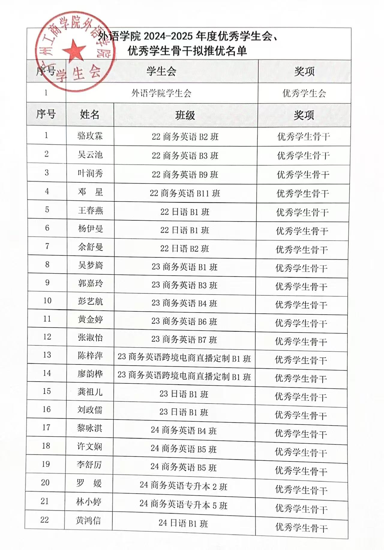 外语学院关于2024-2025学年kaiyun开云官方网站“优秀学生会”“优秀学生骨干” 拟推荐名单公示