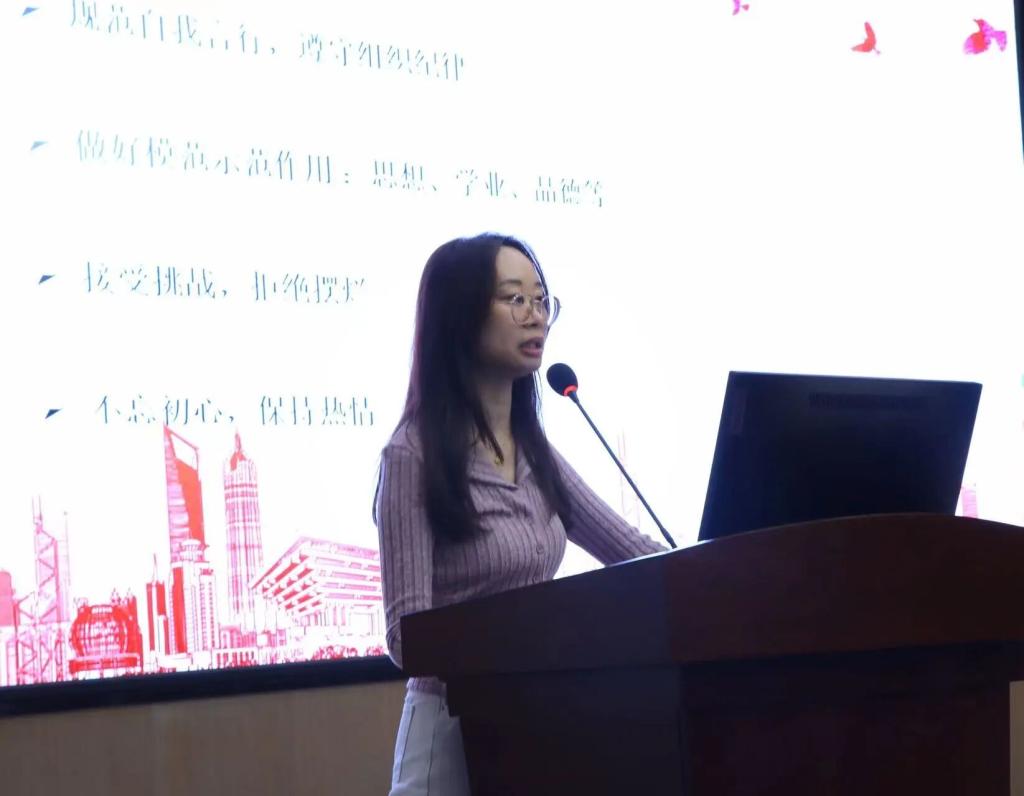 外语学院团委书记处成员许文娴同学进行发言,她总结了团学近期工作中存在的不足,结合自身分享了对外语学院团学的感悟和体验;并且以此勉励团学的干部与干事更加积极地参与团学活动,从中获得满足和反馈,有所收获。