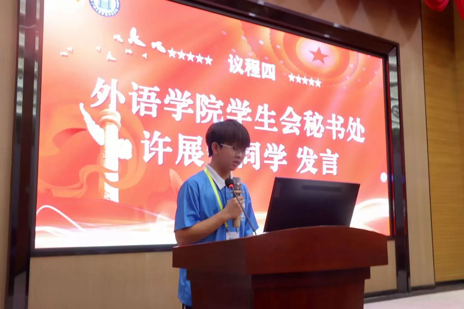 外语学院学生会秘书处许展铭同学进行发言,他强调青年担当是团学工作的核心底色,作为外语学院团学的一员,更应立足团学岗位践行使命。他分享了各类团学活动的经历以及工作心得,并期盼与大家并肩前行、互学互促,共同在成长中实现自我提升。
