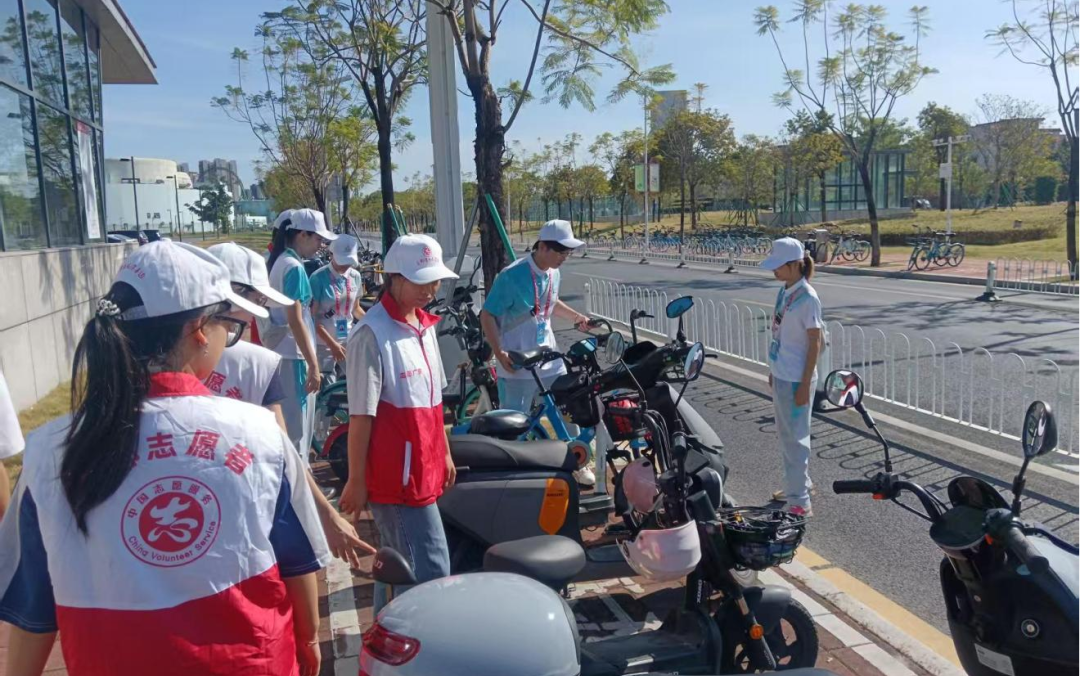 他们还投入到融创茂周边非机动车的整理工作中——这是乐园入口处一道亮眼的“志愿红”风景线。他们分工协作,有的弯腰调整车辆摆放角度,有的将散乱的电动车归位到指定区域,有的轻轻挪动车辆留出通行空间,动作利落又细心。面对停放不规范的车辆,志愿者们耐心整理,同时还主动提醒路过的市民“请将车辆停到划线区域”,用实际行动引导文明停放习惯。阳光下,他们穿梭在车辆间的身影,让原本杂乱的停车区变得整齐有序,也让游客入园的第一印象更舒心。