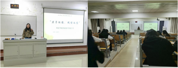 为提高大学生对国家助学贷款政策的认知,增强学生的信用意识和倡导诚信为本的价值观,外语学院于12月11日19点在教学楼417室开展“君子怀德,诚信还贷”讲座。本次讲座由外语学院资助经办人钱宏叶老师主持,外语学院生源地贷款大四学生参与。