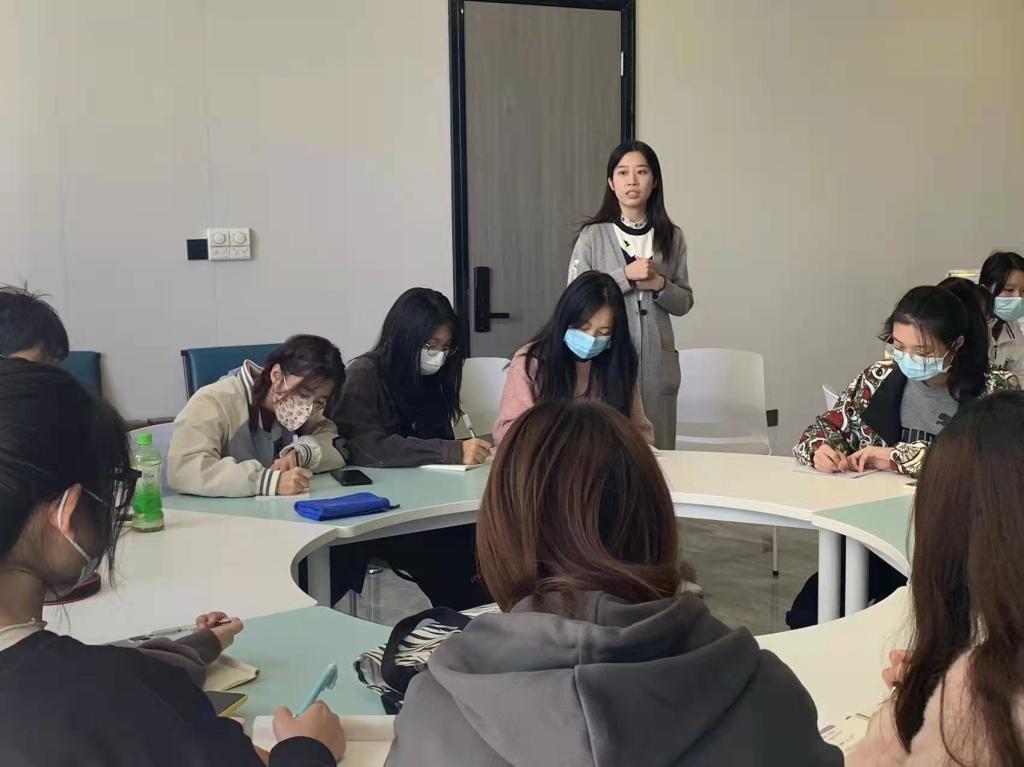 为了外语学院心灵港湾2021级干事能了解到科学的朋辈辅导知识,外语学院心灵港湾服务队于2021年11月25日在图书馆6楼心理中心团体辅导室举行了“朋辈帮扶”培训活动。本次活动的指导老师为唐奕佳老师。出席人员有主讲老师唐奕佳老师、外语学院心灵港湾服务队全体成员。本次活动的主题是助人自助,从“心”出发,旨在使心灵港湾队员具有一定的朋辈帮扶知识,掌握一定的心理学知识、心理咨询理论和技能。