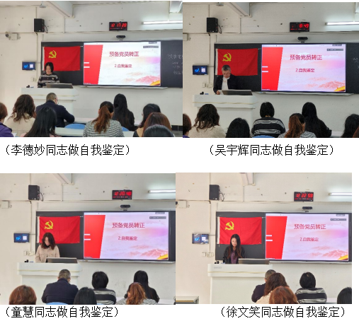 在个人自我鉴定环节,四位预备党员依次发言。李德妙、吴宇辉、童慧、徐文笑分别汇报了对党的认识、入党动机、个人经历以及预备期间的工作、学习和生活情况。他们一致表示,成为正式党员后,将继续努力提升思想政治觉悟,不断强化自身能力,以更高的标准要求自己,为党和人民的事业贡献更多力量。