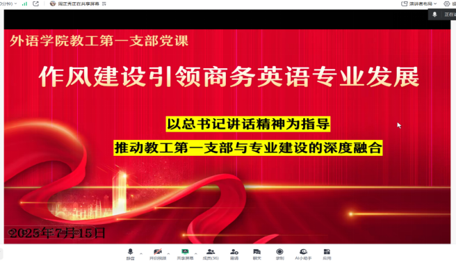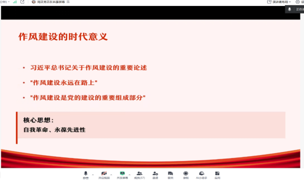 为深入贯彻中央八项规定精神学习教育和习近平总书记关于作风建设的重要讲话要求,推动新时代高校基层党组织全面从严治党向纵深发展,7月15日19:00-20:00,外语学院教工第一党支部通过腾讯会议召开党课学习与作风建设专题研讨会,此次会议共37名党员教师参会,会议由党支部书记周正秀同志主持。