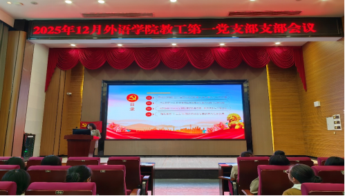 2025年12月4日下午,外语学院教工第一党支部在图书馆416召开“深入学习贯彻党的二十届四中全会精神”专题学习会,会议由外语学院教工第一党支部书记周正秀同志主持,共35名教师党员参会。会议以专题课件讲解为主线,结合“十五五”规划主题视频展播,推动全会精神入脑入心。