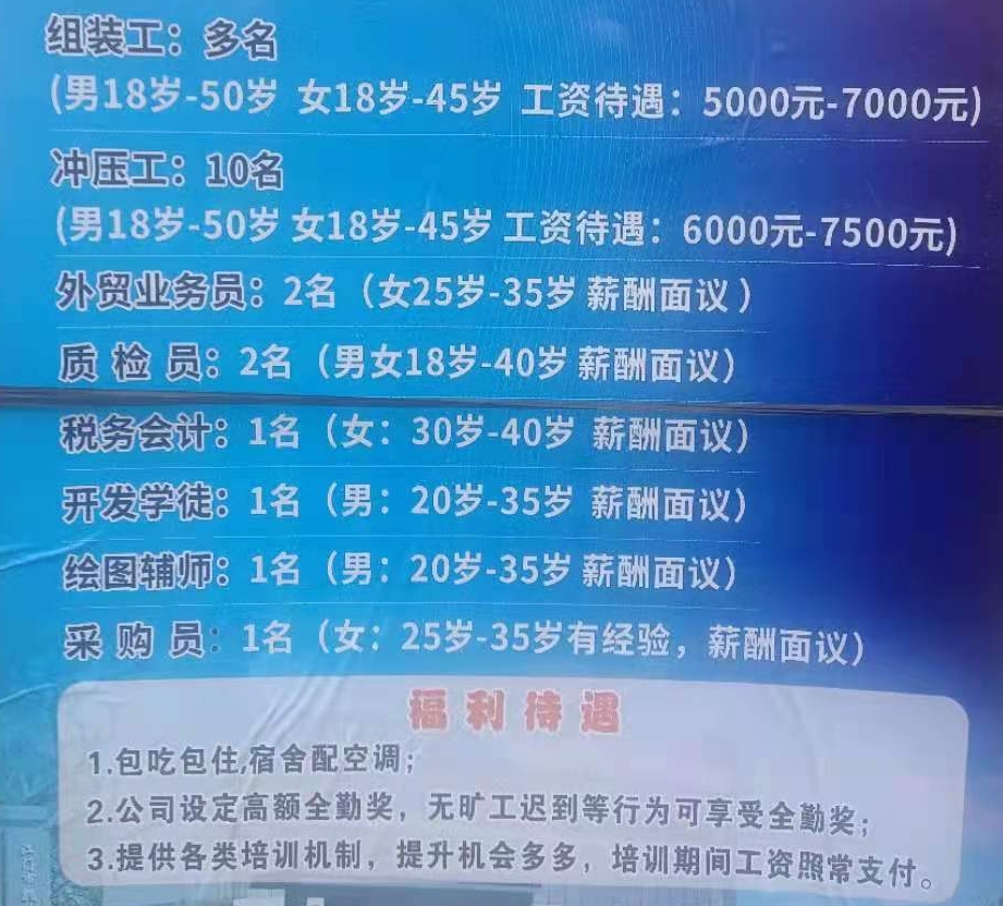 我司交通便利,公司提供食堂、宿舍,设有优秀员工奖,全勤奖等员工福利。现因公司发展或扩张厂房及业务发展需要,现面向社会诚聘以下人员。愿您的加入给我们带来新的活力,我们也将为您提供广阔的发展空间!