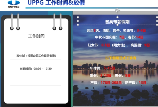 工作时间:五天8 小时工作制,每周 40 小时,加班按劳动法规定支付加班费,每年七八月份统一安排员工放 9 天高温假;