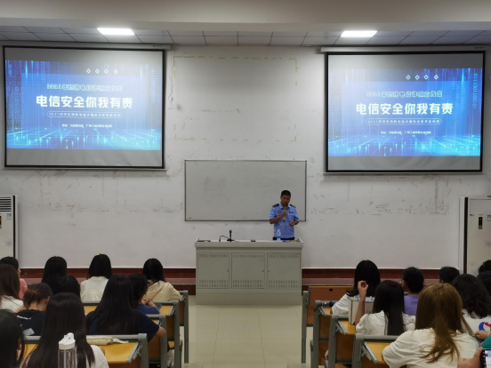 在讲座进行过程中,岑警官做了9月至10月的关于学校电信诈骗警情的通报和总结,其中最近的一起电信诈骗就发上在12号,此次案情发生后迅速被国家发诈中心APP信息截取,并信息下发到片区,辖区派出所通知学校保卫处工作人员到校门口对接到访民警,查实学生身份,通知辅导员马上找到对应学生了解情况,如有发现学生发生被骗行为,及时制止。整体过程十分迅速,经与学生核实,学生已经参加过预防电信诈骗主题班会,因此意识到可能是诈骗电话,并直接挂断电话后不在接听,但是该学生手机虽然安装国家反诈APP,但未打开来电预警功能,所以国家发诈中心系统并不能迅速核实学生信息,这是本次警情钟发现的问题。现场岑警官再次要求同学们在手机上进行了APP的设置,辅导员毕老师注意检查时候打开来电预警功能,要求每位同学做好电子信息的基本的防护功能。
