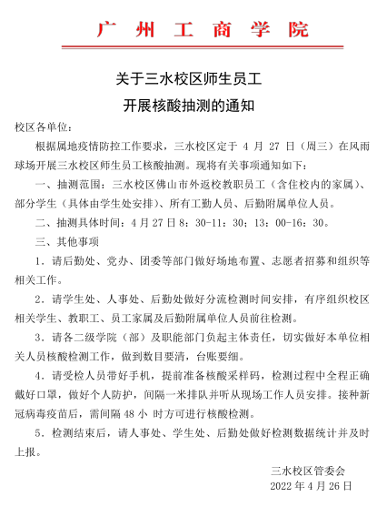 关于三水校区师生员工开展核酸抽测的通知