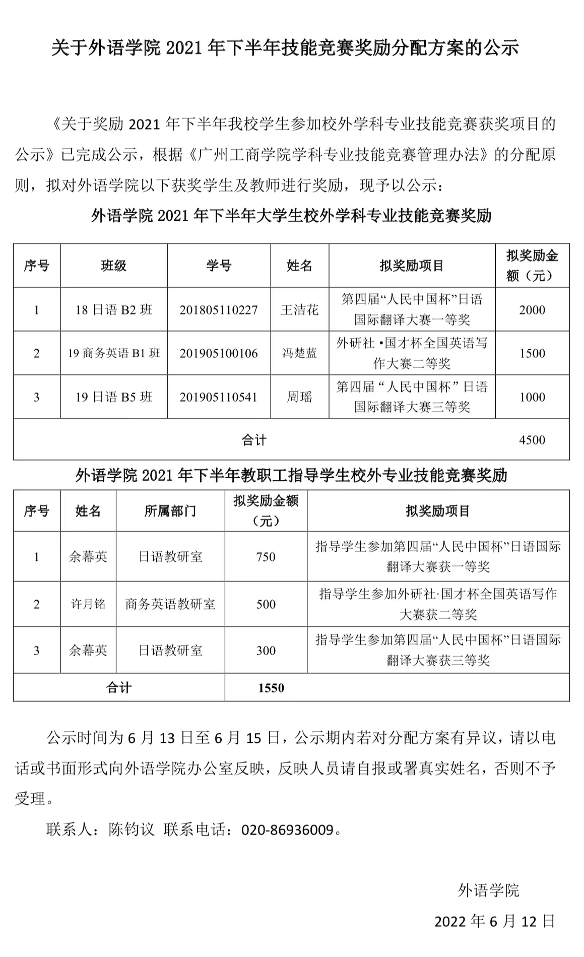 关于外语学院2021年下半年技能竞赛奖励分配方案的公示