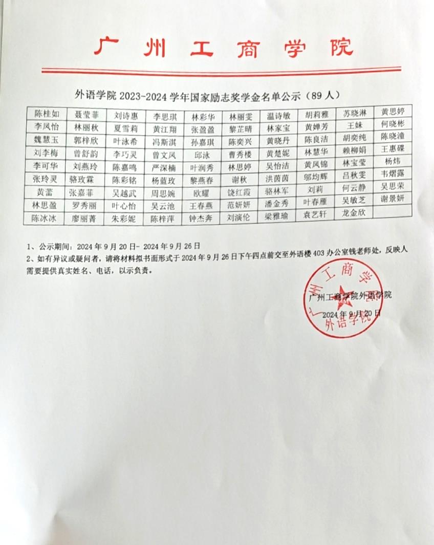 关于外语学院2023-2024学年国家励志奖学金增补名单的公示
