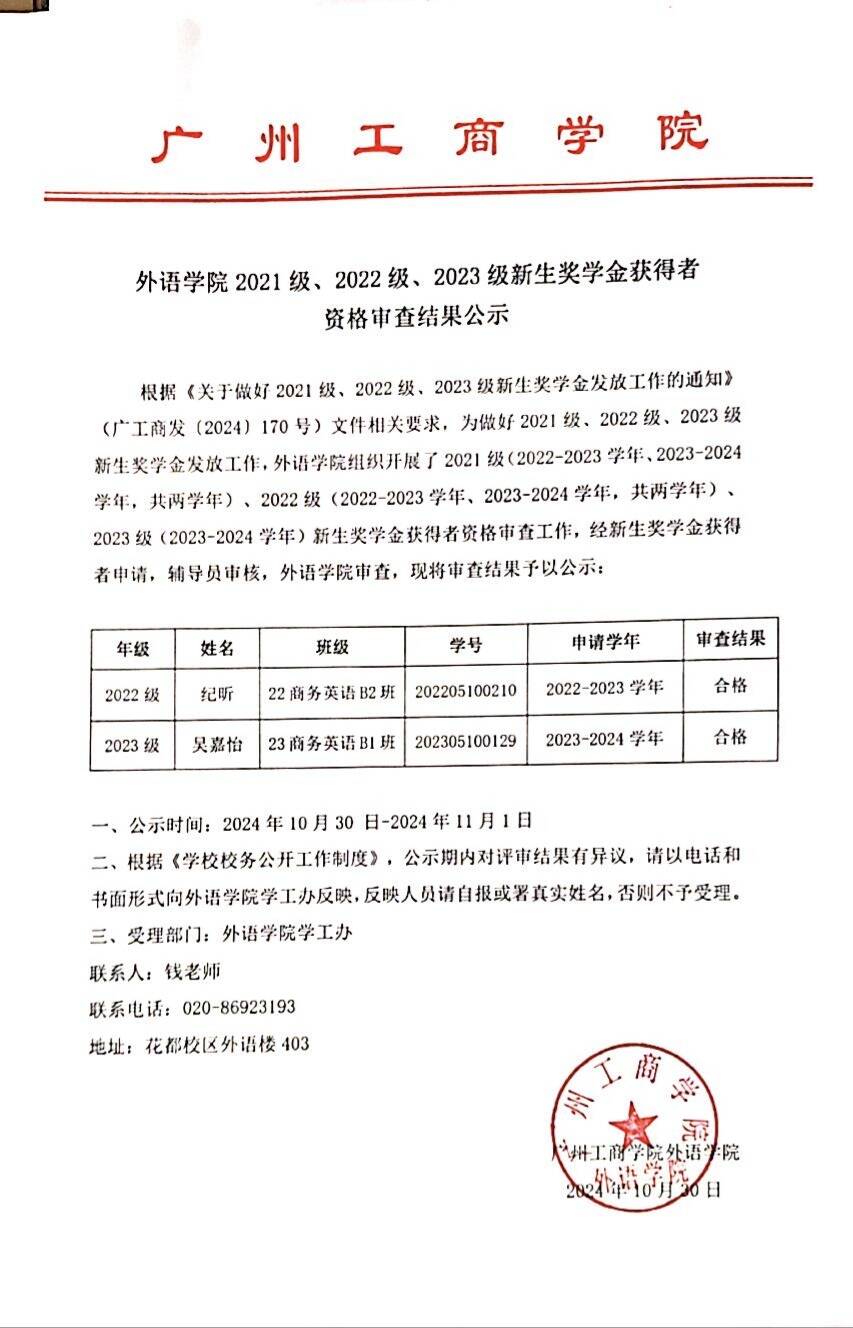 外语学院2021级、2022级、2023级新生奖学金获得者资格审查结果公示