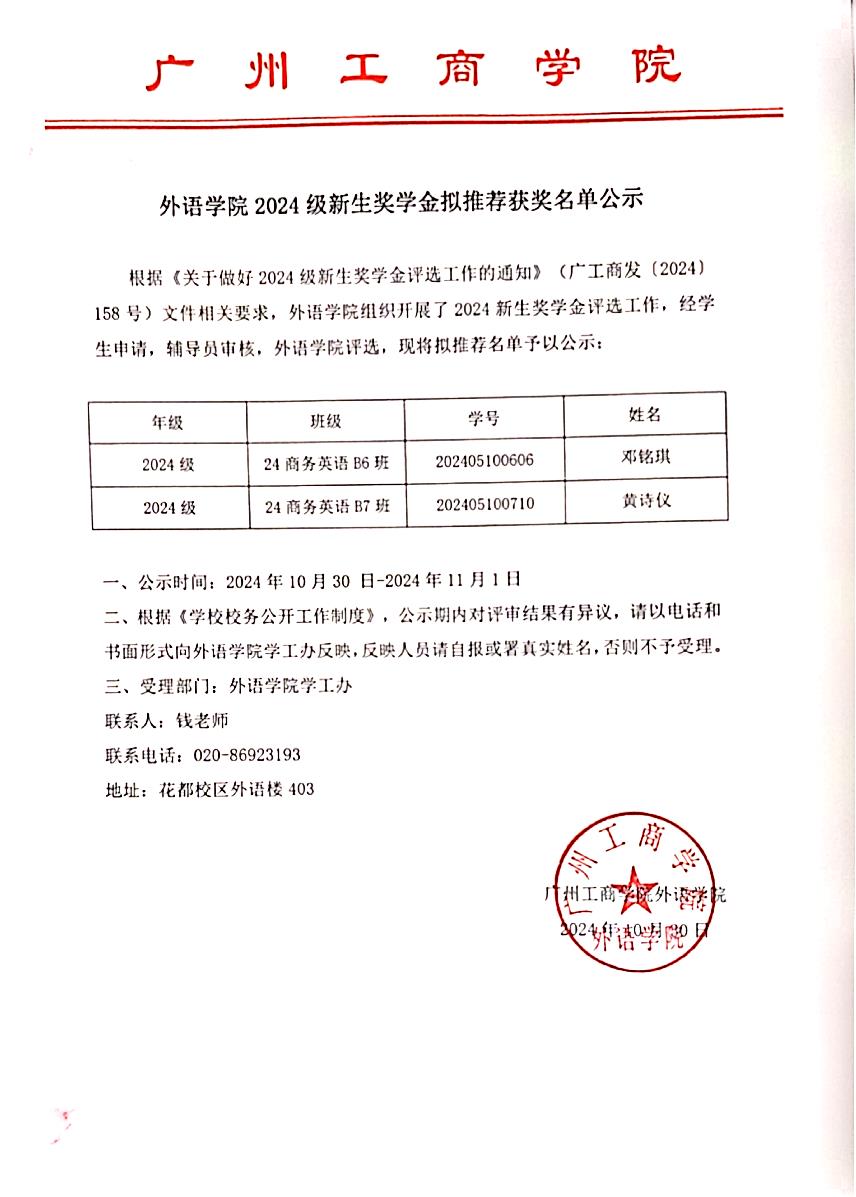 外语学院2024级新生奖学金拟推荐获奖名单公示