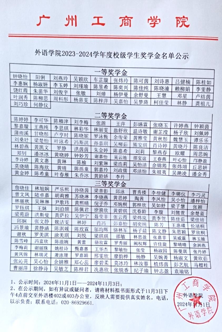 外语学院2023-2024学年度校级学生奖学金名单公示