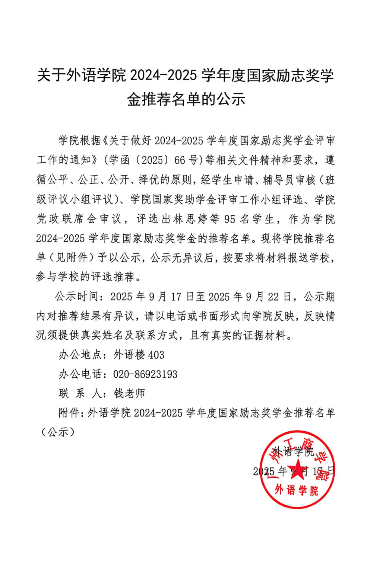 关于外语学院2024-2025学年度国家励志奖学金补选拟推荐的公示