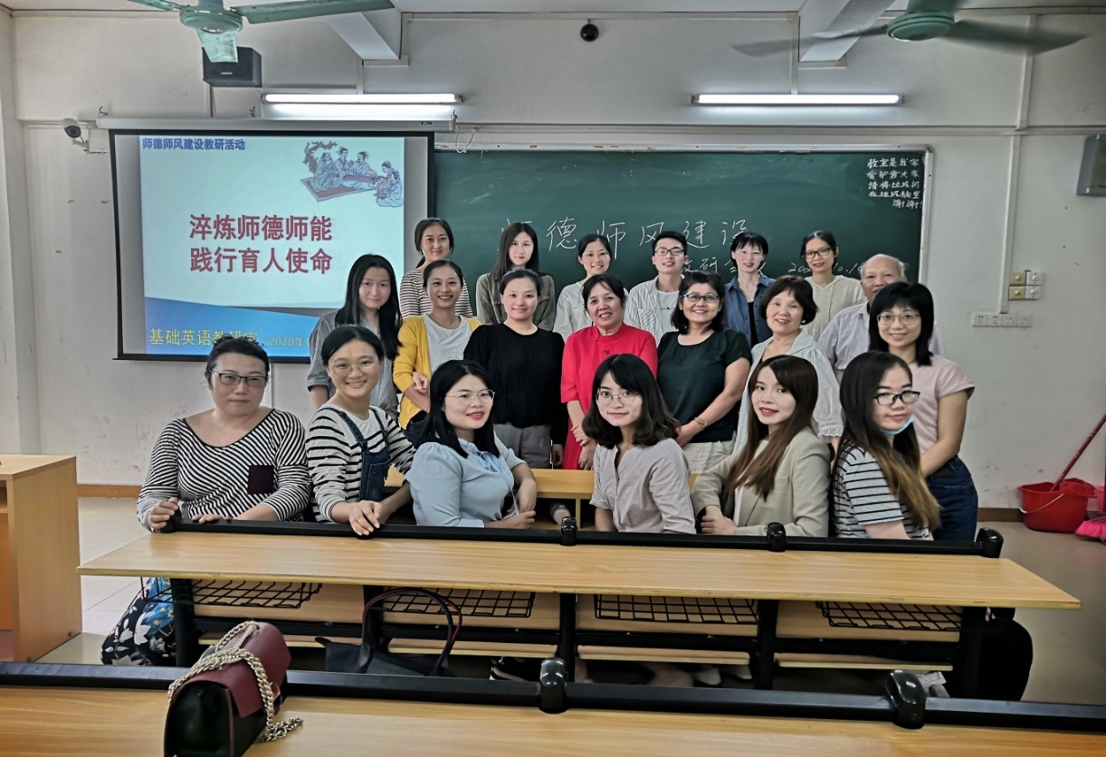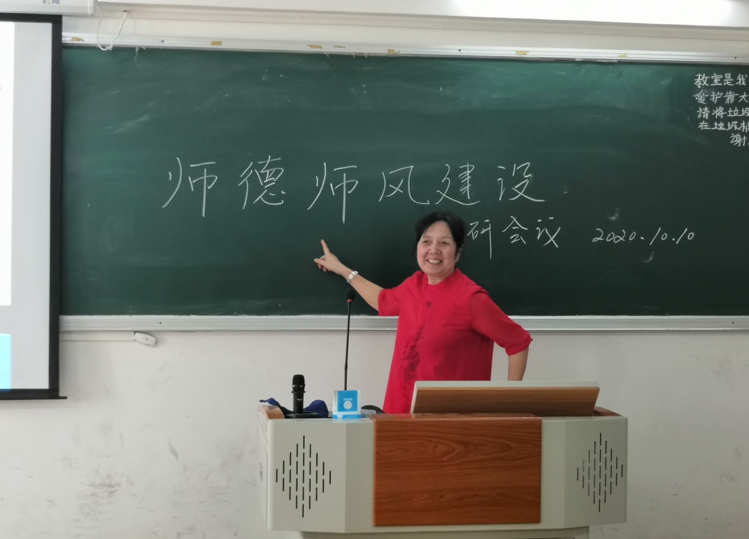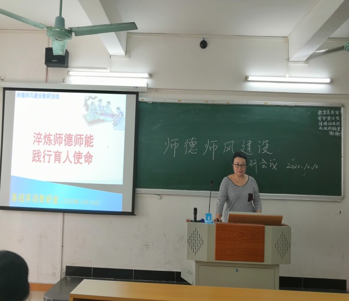根据学校师德建设主题教育月活动工作部署,为落实kaiyun有关师德师风建设工作、进一步推进基础英语教研室教师德师风建设、提高教师职业道德修养,10月10日下午基础商务英语教研室全体教师召开了师德师风建设教研活动,周正秀老师担任主持。