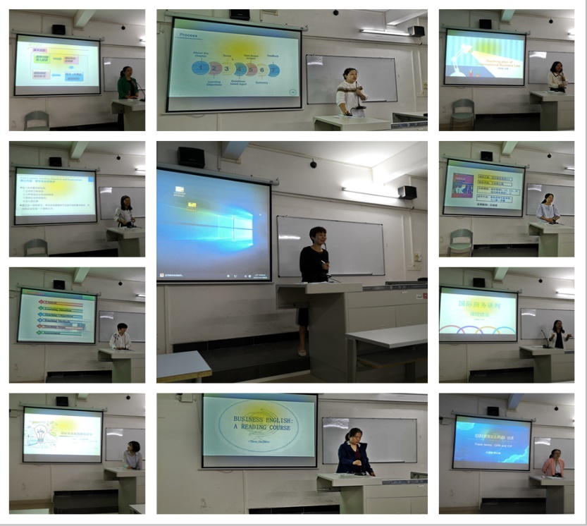 《国际贸易实务英语》课程教学万绍华老师、《国际商法》课程教学刘姝昕老师、沈蒙老师、邓欣怡老师、《综合商务英语III》课程教学石成成老师、《商务英语视听说》课程教学刘艳芳老师、《国际商务谈判》课程负责人冯伟婷老师、《国际贸易流程模拟实训》课程教学罗有晶老师、以及《商务英语阅读III》课程教学周素娟老师与《国际贸易实务英语》课程教学曾永健老师依次进行说课。其中,说课程建设的冯伟婷老师围绕人才培养方案,结合《外国语言文学类教学质量国家标准》和《高等学校商务英语专业本科教学质量国家标准》,从课程设置与人才培养目标、课程类别与性质、课程与其他课程的关系、课程团队建设、课程改革情况、问题和对策六个方面进行系统阐述和分享;说课程教学的9位老师用流利的双语、精美的课件诠释了自己对教材的独特理解和匠心设计,给大家描绘出一个个生动的课堂,展现出教育的智慧和个人的独特风采。
