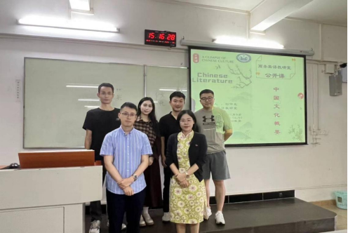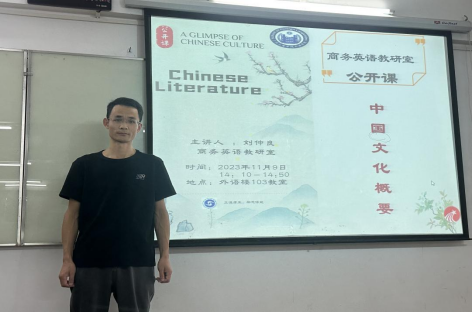 11月9日下午,外语学院商务英语教研室在外语楼103教室举行公开课,《中国文化概要》课程组的刘仲良老师为大家带来“中国文学”专题课程。整个课程紧凑有序,主题明确,刘老师先后回答了三个问题:什么是文学?中国文学的特征是什么?学习文学的意义何在?他在课堂上展示了卓越的教学风采和深厚的文学素养,课程获得了教师和学生们的一致好评。参加听课的老师有外语学院王天枝副院长、商务英语教研室全体教师以及部分学生。此次活动由商务英语教研室主任周正秀老师主持。