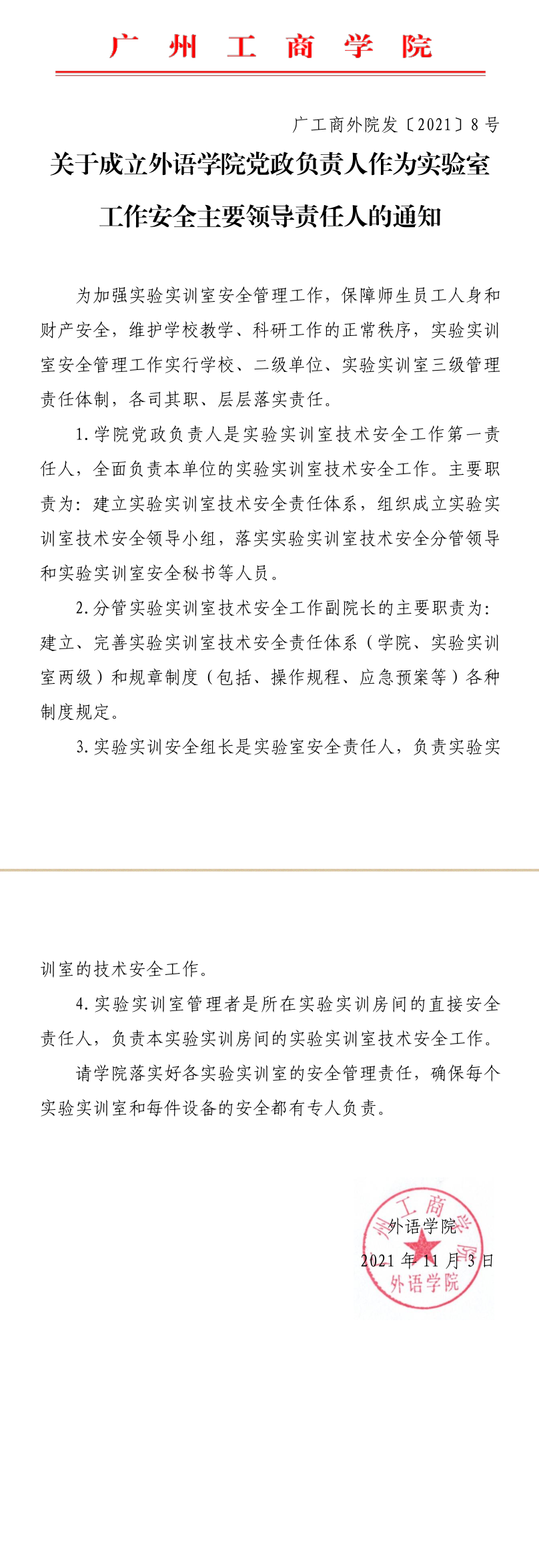 关于成立外语学院党政负责人作为实验室工作安全主要领导责任人的通知