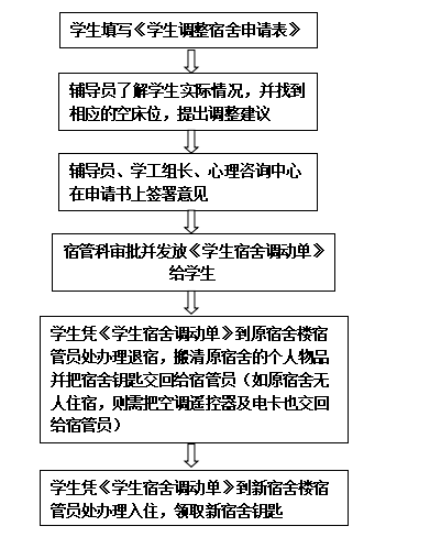 第五步:学生本人带上申请书到宿管科,宿管科了解情况后,如同意调整,则发放《学生宿舍调动单》。