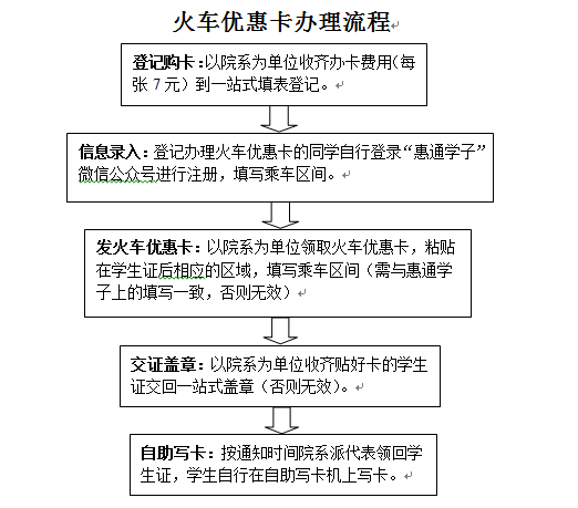 现学生处为学生统一购买火车票购票优惠卡,请各院系通知需办卡学生(新、老生均可办)以院、系为单位收齐办卡费用(每张7元,微信转账),于10月14日前交到一站式服务中心并填表登记,逾期不受理。