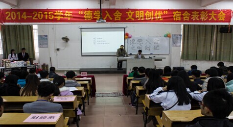 2014年12月18日15时,学生宿舍管理委员会在计算机楼103举办2014—2015年“德学入舍文明创优”宿舍表彰大会。学生处黄鹏处长,学生处谭全副处长,学生科孙洪波科长,宿舍管理科谢静副科长、叶萌萌老师,学生科罗文威老师及各系辅导员老师、文明宿舍代表、趣味运动会代表、学生宿舍管理委员会全体成员出席了本次会议。